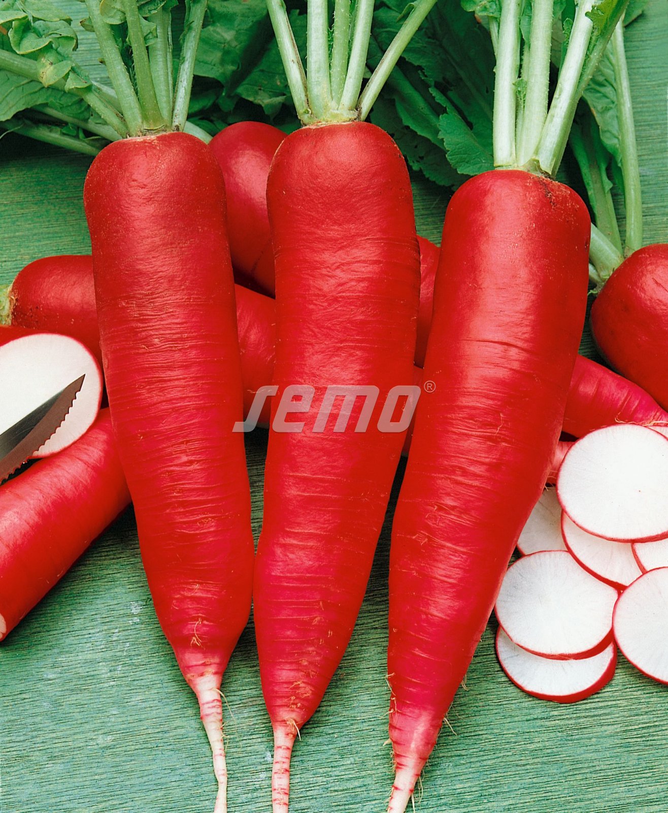 A summer radish with red elongated roots, 15-20 cm long (a third protruding from the soil). The tip of the roots is white, the same as its flesh. For both fresh and short-term storage. We sow from mid-summer. Earlier sowings are sensitive to bolting.
